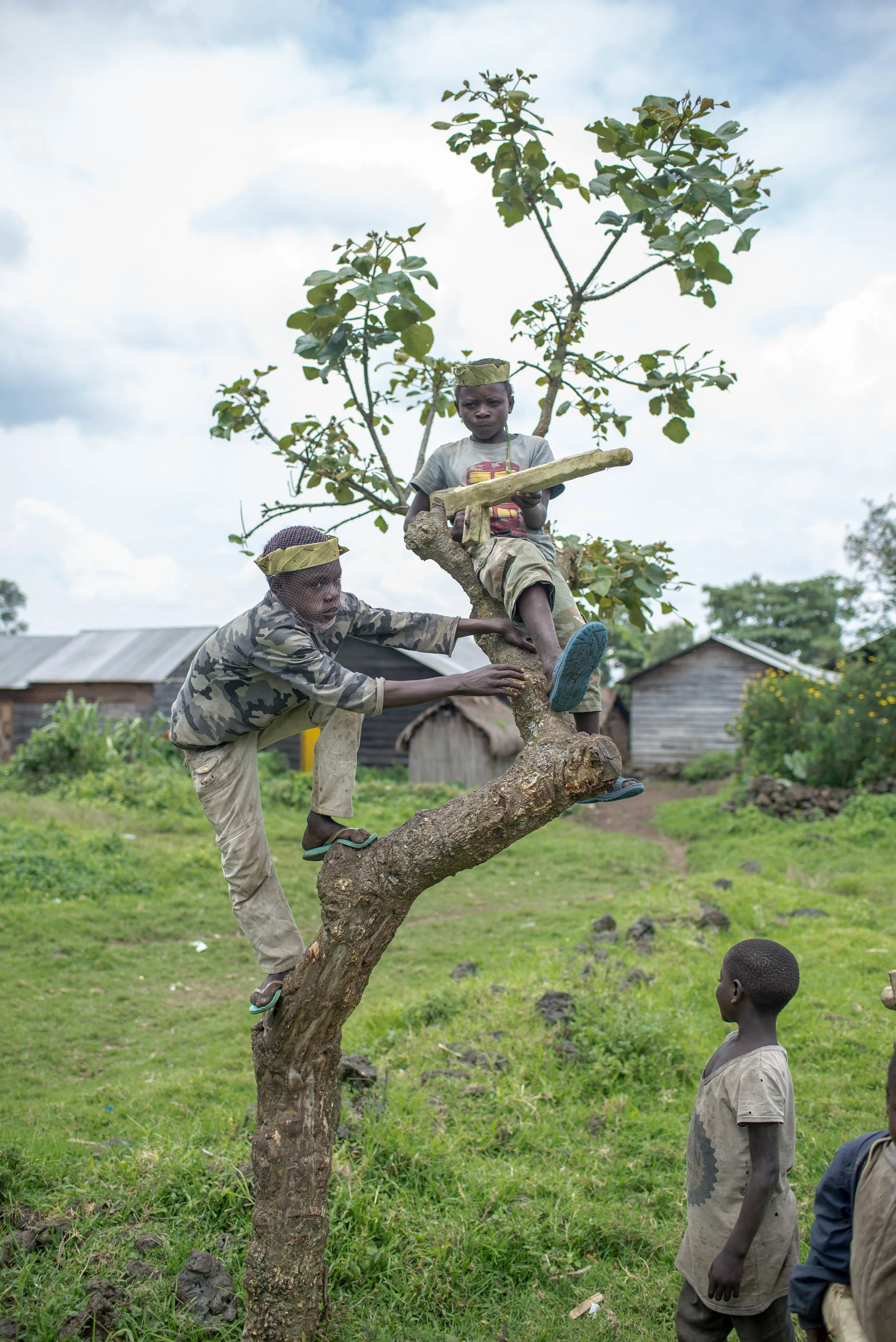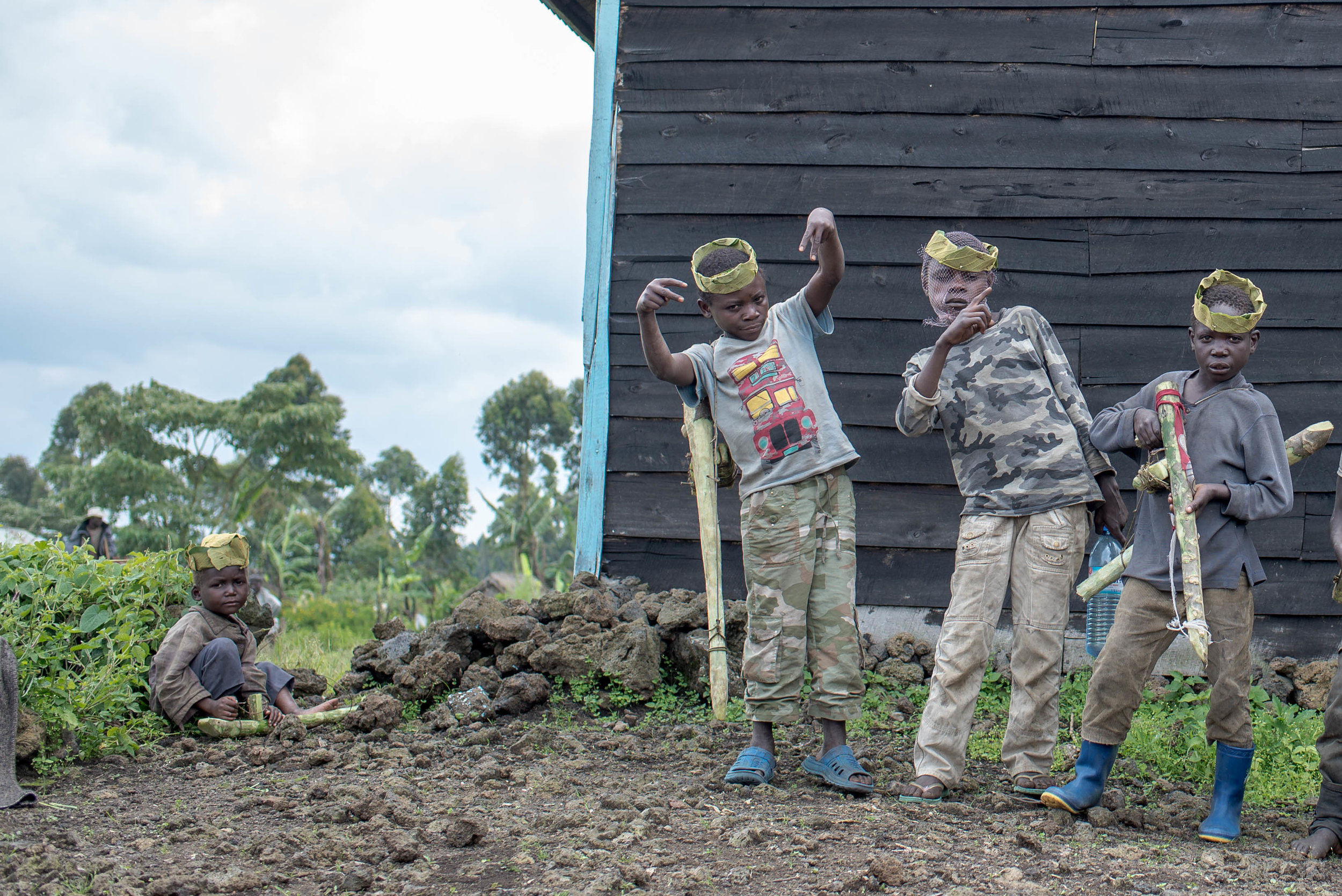 Children copy what they know. These kids were photographed in Masisi in eastern DRC in November 2014. The area was recovering from violent clashes between militia and the national army in the region in 2013 and armed groups still operated nearby - this meant a high military presence with obvious effects on young minds.
