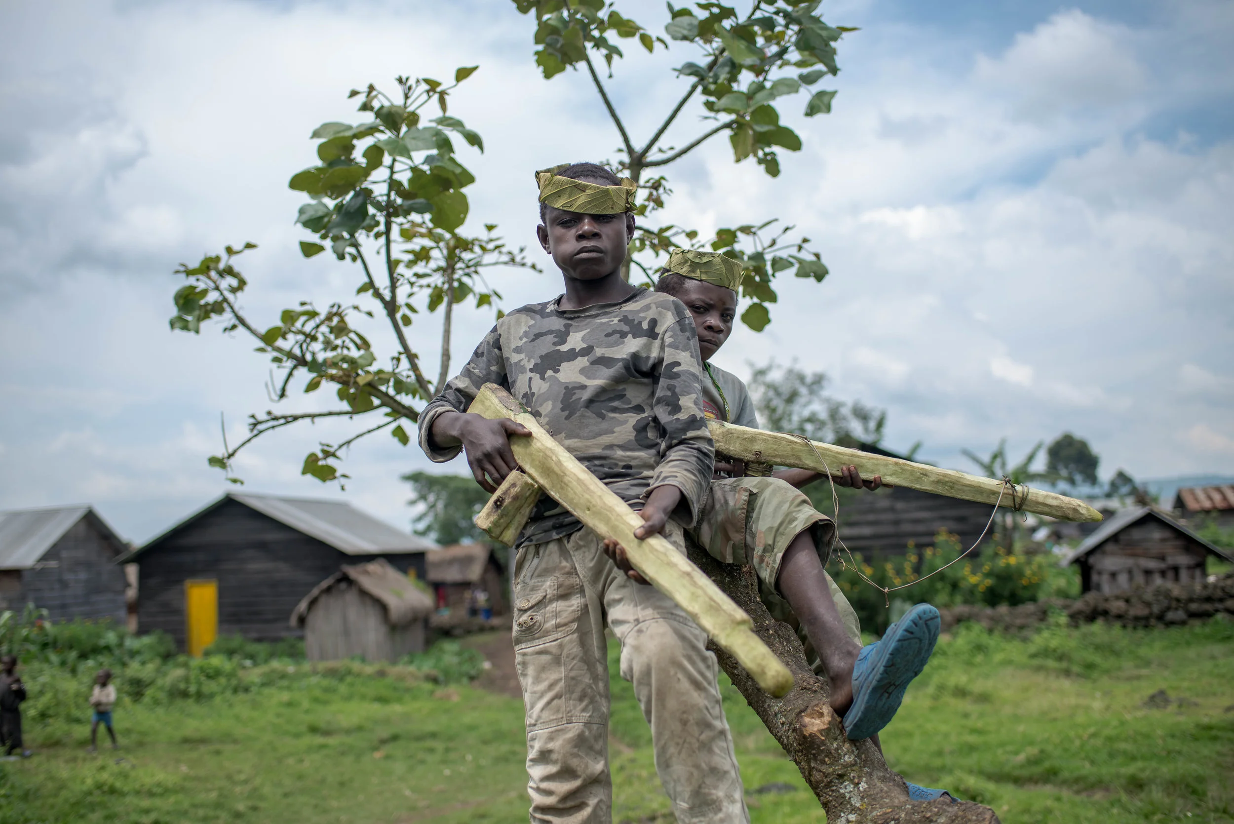 When playing, children copy what they know. These photographs are from Masisi in eastern DRC in November 2014. The area was recovering from violent clashes between militia and the national army in the region in 2013 and armed groups still operated nearby - this meant a high military presence with obvious effects on young minds.
